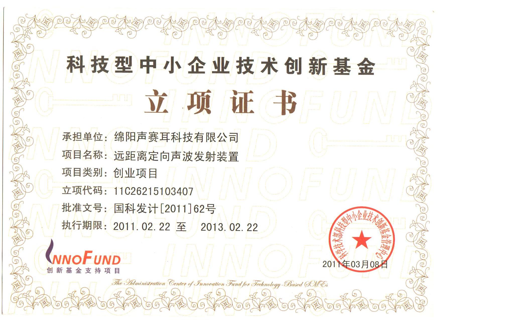 2011年9月16日,我公司正式取得中華人民共和國科學(xué)技術(shù)部中小企業(yè)技術(shù)創(chuàng)新基金管理中心簽發(fā)的“遠(yuǎn)距離定向聲波發(fā)射裝置”立項證書,這標(biāo)志著我公司科技創(chuàng)新取得重大突破。